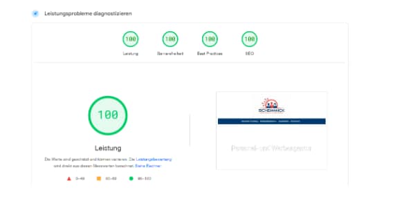 Schemmick erreicht eine perfekte Bewertung von 100/100 Punkten bei Google PageSpeed Insights – ein klarer Hinweis auf hervorragende SEO‑Optimierung und technische Performance.